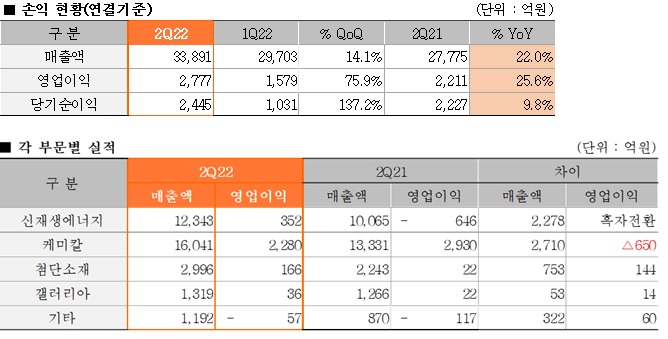 □ 분기 매출3조3891억원, 영업익 2777억원… 태양광, 석유화학 포트폴리오 효과